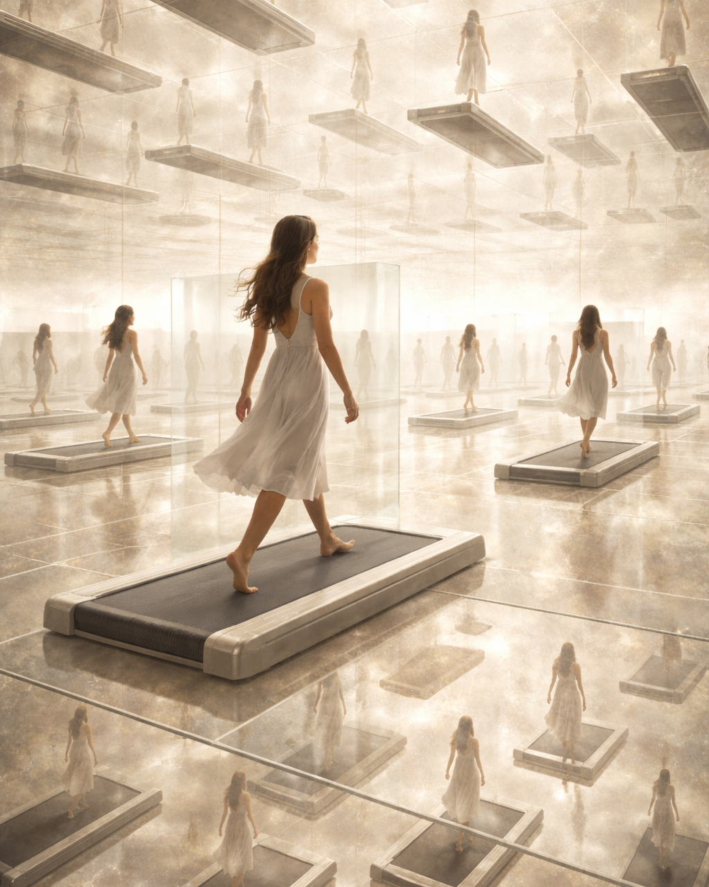 Now imagine walking on a treadmill. You are always moving forward. Time appears to progress, yet your position within the grid is determined by alignment rather than motion. Beside you are countless treadmills, separated by invisible glass, each carrying a different version of you. They exist simultaneously, layered infinitely across every axis of reality.